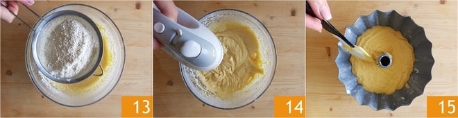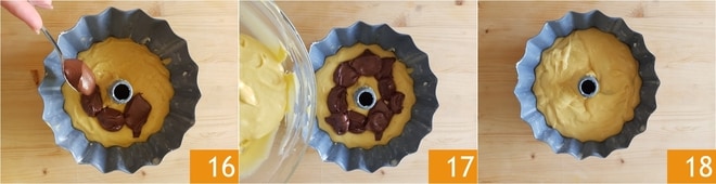 Fügen Sie die restlichen trockenen Zutaten hinzu 13 und rühren Sie weiter mit den Rührgeräten 14. Geben Sie einen letzten Rührvorgang mit einem Spatel und geben Sie die Hälfte der Mischung in eine zuvor eingefettete Gugelhupfform von 22 cm. Glätten Sie die Oberfläche mit dem Spatel 17.