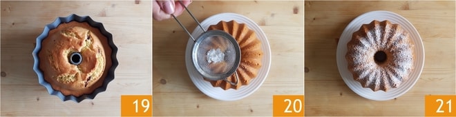 Machen Sie den Zahnstocher-Test, bevor Sie den Kuchen ausformen 19. Lassen Sie ihn abkühlen, stürzen Sie ihn auf eine Servierplatte und bestäuben Sie ihn mit Puderzucker 20. Der Nutella-Gugelhupf ist servierfertig 21.