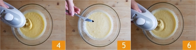 Rühren Sie weiter für etwa 5 Minuten 4, bis Sie eine voluminöse und schaumige Mischung erhalten. Fügen Sie die Samen der Vanilleschote hinzu 5 und rühren Sie die Mischung noch eine Minute lang 6.