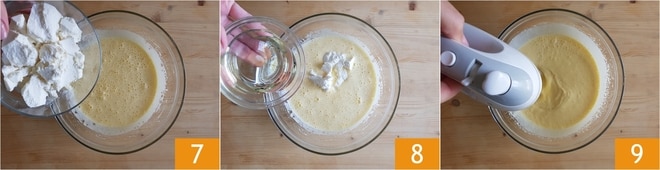 Fügen Sie den gut abgetropften Ricotta 7 und das Öl 8 hinzu. Mischen Sie mit den elektrischen Rührgeräten, bis Sie einen glatten und homogenen Teig erhalten 9.