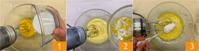 Um den Nutella-Mascarpone-Kuchen zuzubereiten, schmelzen Sie zuerst die Butter in einem kleinen Topf und lassen Sie sie abkühlen. In der Zwischenzeit schlagen Sie die Eier zusammen mit dem Zucker mit einem elektrischen Mixer auf 1. Nach etwa 10 Minuten ist die Masse luftig und schaumig, dann gießen Sie die geschmolzene und abgekühlte Butter unter Rühren in einem dünnen Strahl dazu 2. Abschließend die zuvor gesiebten trockenen Zutaten hinzufügen, dabei den Mixer weiterlaufen lassen: beginnen Sie mit dem Mehl, einen Esslöffel nach dem anderen 3.