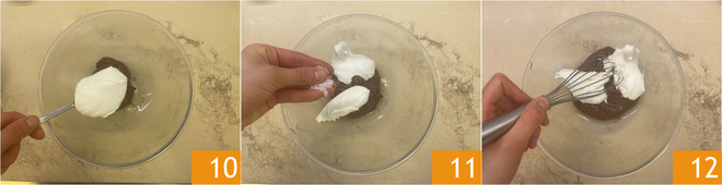 In der Zwischenzeit bereiten Sie die Creme für die Füllung vor: In einer Schüssel Nutella und Mascarpone zusammengeben 10, dann eine Prise Salz hinzufügen 11 und mit dem Schneebesen gut vermischen 12. Geben Sie die erhaltene Creme in einen Spritzbeutel mit einer glatten Tülle.