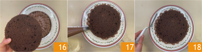 Legen Sie die zweite Schicht darauf 16, dann drücken Sie etwas Creme an den Rändern heraus 17 und glätten Sie sie mit der Spachtel, um sie gleichmäßig zu verteilen 18.