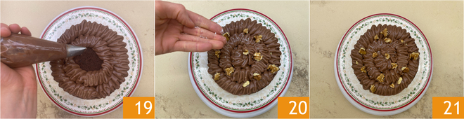 Mit der restlichen Creme die Oberfläche dekorieren, indem kleine Wellen von oben nach unten geformt werden 19. Zum Schluss mit Nüssen und Maldon-Salz garnieren 20. Ihr Nutella-Mascarpone-Kuchen ist bereit zum Genießen 21!