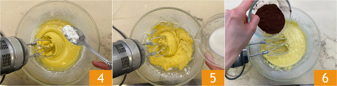 Fügen Sie auf die gleiche Weise auch die Maisstärke hinzu 5. Nachdem alle trockenen Zutaten eingearbeitet sind, mit der Milch verdünnen 5 und zum Schluss den Kakao hinzufügen 6.