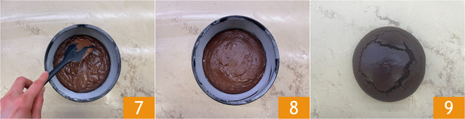 Sobald sie abgekühlt ist, schneiden Sie die Kuppel des Kuchens ab, um die Oberfläche zu glätten 13 und teilen Sie ihn horizontal in zwei Hälften 14. Füllen Sie die erste Schicht mit der Creme 15.
