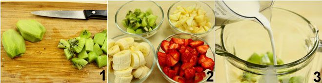 Um den Frucht-Smoothie zuzubereiten, beginnen Sie damit, die Kiwi zu schälen, dann schneiden Sie sie in Würfel und entfernen den weißen Mittelteil 1. Waschen Sie die Pfirsiche, schälen Sie sie und schneiden Sie sie in Würfel. Waschen Sie die Erdbeeren, entfernen Sie den grünen Stiel und halbieren Sie sie, zuletzt schälen Sie die Bananen und schneiden Sie sie in Scheiben 2. Geben Sie alle Früchte in das Glas eines Mixers und fügen Sie die Milch hinzu. Mixen Sie alles, bis Sie eine glatte und homogene Mischung erhalten. Sofort servieren!