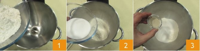 Bereiten Sie den Obstkranz vor, indem Sie das Mehl in die Schüssel einer Küchenmaschine geben 1, dann fügen Sie den Zucker 2 und die Trockenhefe 3 hinzu,