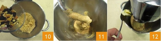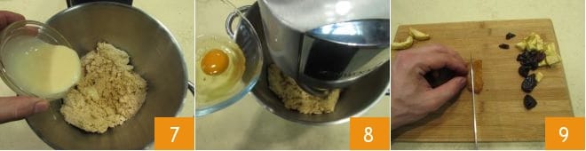 Wenn die Eier aufgenommen sind, stoppen Sie die Küchenmaschine, dann fügen Sie die gezuckerte Kondensmilch hinzu 7, mischen Sie weiter mit dem Haken und fügen Sie das letzte der 4 Eier hinzu 8. Hacken Sie auf einem Schneidebrett das getrocknete Obst grob in Würfel 9