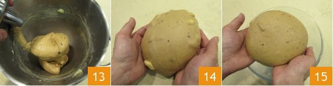 und arbeiten Sie weiter, bis Sie einen glatten und gut gebundenen Teig erhalten 13. Nehmen Sie den Teig aus der Maschine und bearbeiten Sie ihn ein wenig auf der Arbeitsfläche, um ihm eine runde Form zu geben 14. Legen Sie ihn in ein leicht gebuttertes Gefäß 15 und lassen Sie ihn 2-3 Stunden im ausgeschalteten Ofen mit eingeschaltetem Licht aufgehen, bedeckt mit Frischhaltefolie.