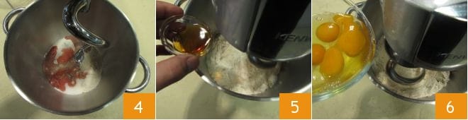 gießen Sie den Orangensaft 4 ein und beginnen Sie mit dem Knethaken zu mischen, dann fügen Sie den Kräuterlikör 5 und den Orangensaft hinzu. Beginnen Sie zu kneten, indem Sie jede der 3 Eier einzeln hinzufügen 6.