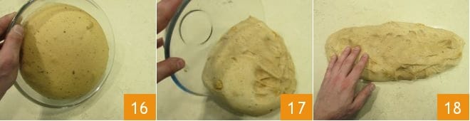 Nach der erforderlichen Zeit hat sich der Teig verdreifacht 16; drehen Sie ihn auf die Arbeitsfläche 17 und bearbeiten Sie ihn mit den Fingerspitzen, bis Sie ein Rechteck von 15x30 cm erhalten 18.