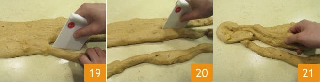 Dann schneiden Sie mit einem Teigschaber den Teig der Länge nach 19, sodass Sie 3 Streifen erhalten 20, und verbinden Sie diese an einem Ende 21