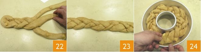 damit Sie beginnen können, die drei Streifen wechselweise zu flechten 22, bis Sie einen Zopf erhalten 23. Legen Sie dann den Teig in eine leicht gebutterte Kranzform von 25 cm Durchmesser 24