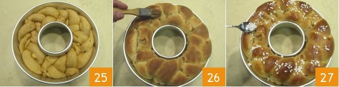 und lassen Sie ihn 1-2 Stunden aufgehen 25, bedeckt mit Frischhaltefolie, geschützt vor Luftzügen. Nach der erforderlichen Zeit backen Sie im vorgeheizten statischen Ofen bei 170° für 50-60 Minuten (bei Umluftofen bei 150° für 40-50 Minuten), immer die Stäbchenprobe machen, bevor Sie den Kranz herausnehmen. Sobald er gebacken ist, nehmen Sie ihn aus dem Ofen und bestreichen ihn leicht mit Eiweiß 26, dann bestreuen Sie ihn mit Zuckerperlen 27 und lassen den Obstkranz vollständig abkühlen, bevor Sie ihn servieren.