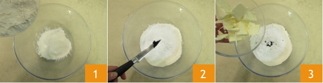 Um die Obsttorte zuzubereiten, beginnen Sie mit dem Mürbeteig: Geben Sie Mehl, Puderzucker 1, die ausgekratzten Samen einer Vanilleschote 2 und die kalte Butter in Stückchen 3 in eine Schüssel.