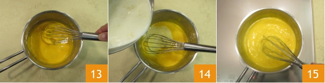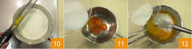 Aromatisieren Sie, indem Sie die Zitronenschale 10 abreiben, stellen Sie die Hitze auf niedrige Stufe und lassen Sie es fast zum Kochen kommen. Geben Sie die Eigelbe in einen anderen größeren Topf, fügen Sie den Zucker hinzu 11 und rühren Sie um. Fügen Sie auch die Maisstärke und das Mehl hinzu 12.
