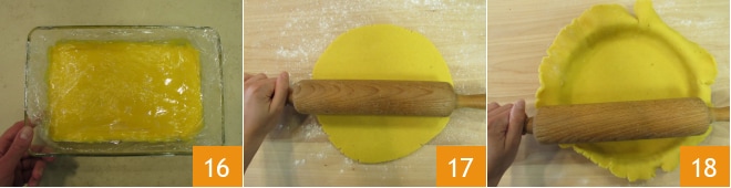 Geben Sie die Creme in einen flachen und breiten Behälter, decken Sie sie mit Frischhaltefolie ab und lassen Sie sie bei Raumtemperatur abkühlen; dann stellen Sie sie in den Kühlschrank, um sie fest werden zu lassen 16. Nehmen Sie den Mürbeteig, rollen Sie ihn auf einer leicht bemehlten Arbeitsfläche aus und schneiden Sie einen Kreis mit einer Dicke von etwa 4 mm aus 17, heben Sie die Scheibe mit dem Nudelholz auf und rollen Sie sie in die 24 cm Form. Rollen Sie das Nudelholz darüber, um die überschüssigen Ränder zu entfernen 18.