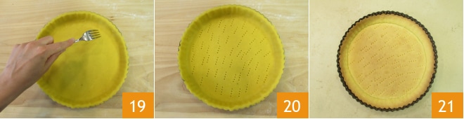 Piksen Sie den Boden mit einer Gabel an 19 und beginnen Sie mit dem Blindbacken: das bedeutet, dass Sie die Basis der Torte ohne Füllung im vorgeheizten statischen Ofen bei 180° für etwa 20/25 Minuten backen 20. Entfernen Sie die Mürbeteigbasis aus dem Ofen und lassen Sie sie abkühlen 21.