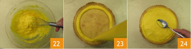 Arbeiten Sie die abgekühlte Creme mit einem Schneebesen 22, geben Sie sie in einen Spritzbeutel und füllen Sie die Mürbeteigschale 23. Glätten Sie die Oberfläche mit der Rückseite eines Löffels und stellen Sie die Torte in den Kühlschrank 24.