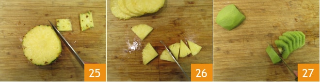 In der Zwischenzeit reinigen und schneiden Sie die Früchte. Beginnen Sie mit der Ananas, schälen Sie sie 25 und schneiden Sie sie in 0,5 cm dicke Scheiben. Schneiden Sie aus jeder Scheibe 8 kleine Dreiecke 26. Wechseln Sie zu den Kiwi, schälen Sie sie, halbieren Sie sie der Länge nach und schneiden Sie sie in Scheiben 27.