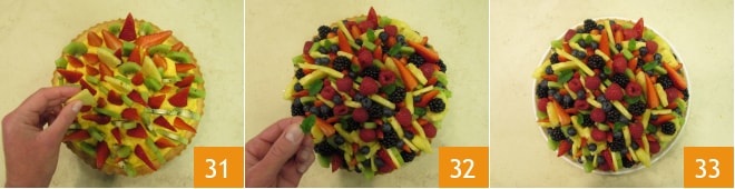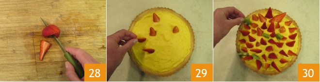 Schließlich kümmern Sie sich um die Erdbeeren. Entfernen Sie den Stiel und schneiden Sie jede in 4 Viertel 28. Fahren Sie mit der Dekoration fort: Machen Sie es nicht zu ordentlich. Dekorieren Sie zuerst mit den Erdbeervierteln, die nach oben zeigen 29, dann fügen Sie die Kiwischeiben hinzu 30.
