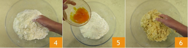Verarbeiten Sie die Zutaten mit Ihren Händen, bis Sie eine sandige Mischung 4 erhalten, dann fügen Sie die Eigelbe hinzu 5 und kneten Sie weiter 6.