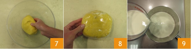 Wenn Sie einen homogenen und weichen Teigblock erhalten haben 7, wickeln Sie ihn in Frischhaltefolie ein und lassen Sie ihn mindestens 30 Minuten im Kühlschrank ruhen 8. Wenn Sie ihn nicht gut in der Schüssel bearbeiten können, wechseln Sie auf eine Arbeitsfläche, um ihn schnell zu verdichten, bis er homogen ist. In der Zwischenzeit bereiten Sie die Konditorcreme vor, indem Sie die Milch in einen kleinen Topf geben 9