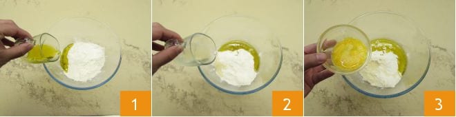 Um die Augen der heiligen Lucia zuzubereiten, geben Sie zuallererst das Mehl in eine Schüssel, fügen Sie das Öl, den Wein 2 und ein Ei 3 hinzu.