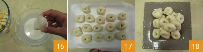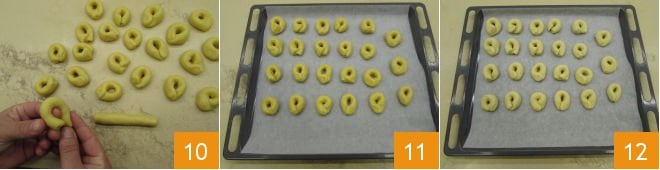 Formen Sie kleine Ringe, indem Sie die gerade geschnittene Rolle schließen 10, sie sollten kleinen Taralli ähneln. Legen Sie sie auf ein mit Backpapier ausgelegtes Backblech 11 und backen Sie sie in einem vorgeheizten statischen Ofen bei 180° etwa 20 Minuten lang. Nach dem Backen herausnehmen 12 und abkühlen lassen.