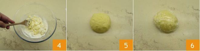 Vermischen Sie zuerst mit einem Holzlöffel 4, dann mit den Händen, bis ein homogener Teig entsteht 5. Legen Sie ihn dann auf ein Nudelbrett und decken Sie ihn mit Frischhaltefolie ab 6, während Sie anfangen, die Kekse zu formen, da er sonst austrocknen könnte.