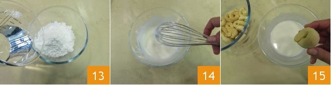 Wenn sie abgekühlt sind, bereiten Sie die Glasur vor. Geben Sie Puderzucker und Wasser in eine Schüssel 13; rühren Sie mit einem Schneebesen, bis eine glatte Glasur entsteht 14. Tauchen Sie dann nur die obere Seite des Tarallino in die Glasur 15,