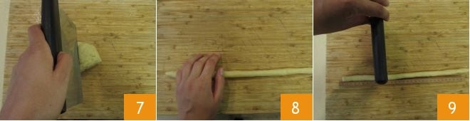 Nehmen Sie dann einen Teil 7 und formen Sie eine Rolle mit einem Durchmesser von etwa 1,5 cm 8. Schneiden Sie dann etwa 10 cm lange Stücke 9.