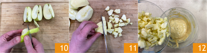 Kommen wir zu den Äpfeln: Schälen Sie sie 10 und schneiden Sie sie zuerst in dünne Scheiben und dann in 1 cm große Würfel 11; Sie benötigen etwa 300 g Fruchtfleisch. Fügen Sie die Äpfel dem Teig hinzu 12 und mischen Sie sie mit einem Löffel ein 12.