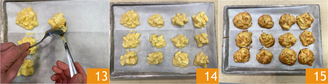 Mit Hilfe von 2 Löffeln formen Sie kleine Teighäufchen auf ein mit Backpapier ausgelegtes Blech, indem Sie sie voneinander abheben; mit diesen Mengen erhalten Sie etwa 20 Stück 13. Backen Sie sie im vorgeheizten statischen Ofen bei 200°C für etwa 20 Minuten 14. Wenn sie goldbraun sind, lassen Sie Ihre Ofenapfelkrapfen auskühlen 15 und genießen Sie sie nach Belieben mit Puderzucker bestreut 15!