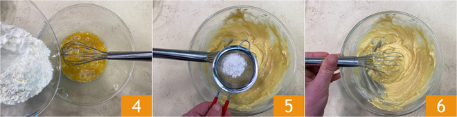 Geben Sie das gesiebte Mehl 4 und das gesiebte Backpulver 5 hinzu und rühren Sie vorsichtig mit dem Schneebesen, um Klumpen zu vermeiden 6.