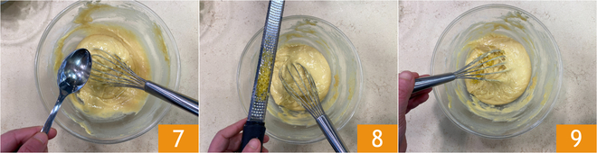 Fügen Sie nun das Öl 7 hinzu und würzen Sie mit der geriebenen Zitronenschale 8. Machen Sie einen letzten Mix und stellen Sie es beiseite 9.