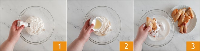 Um die Hähnchenflügel im Ofen zuzubereiten, geben Sie das Joghurt in eine große Schüssel, würzen Sie es mit Salz 1 und Pfeffer, dem Zitronensaft 2 und rühren Sie um. Tauchen Sie die Hähnchenflügel ein 3.