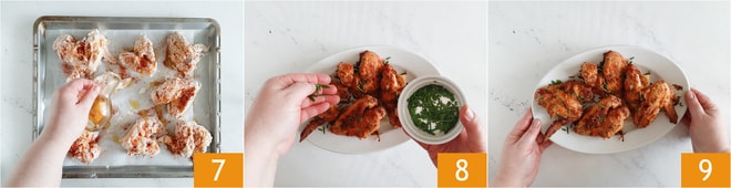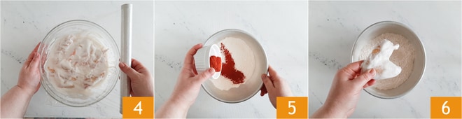 Decken Sie die Schüssel mit Frischhaltefolie 4 ab und lassen Sie sie für 3 Stunden im Kühlschrank marinieren. Nach der Marinierzeit die Flügel grob abtropfen lassen, sodass das Joghurt nicht vollständig entfernt wird. Geben Sie in eine Schüssel das Mehl und den Paprika 5. Panieren Sie die Flügel 6.
