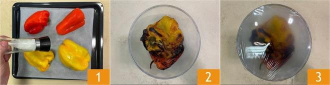 Um die im Ofen gebackenen Paprika zuzubereiten, legen Sie sie zunächst auf ein mit Backpapier ausgelegtes Backblech und salzen Sie 1. Im vorgeheizten Ofen bei 220° im statischen Modus für 50 Minuten backen. Nehmen Sie sie aus dem Ofen und geben Sie die Paprika in eine Schüssel 2, dann mit Frischhaltefolie abdecken 3 und abkühlen lassen. Der Dampf wird das Fruchtfleisch weicher machen und das Schälen erleichtern.