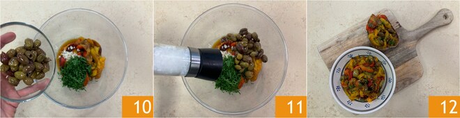 Fügen Sie auch die Taggiasca-Oliven hinzu 10, dann würzen Sie mit Öl, Salz 11 und Pfeffer. Mischen Sie alles und lassen Sie es mindestens 20 Minuten im Kühlschrank ruhen, damit sich die Aromen gut verbinden. Ihre im Ofen gebackenen Paprika sind bereit zum Servieren 12!