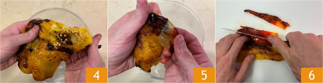 Entfernen Sie nun die Samen 4 und schälen Sie die Paprika 5. Schneiden Sie das Fruchtfleisch in etwa 1 cm dicke Streifen 6 und sammeln Sie sie in einer Schüssel.