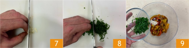 Hacken Sie den Knoblauch 7 und die Petersilie 8 fein mit dem Messer und fügen Sie sie den Paprika hinzu 9.
