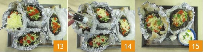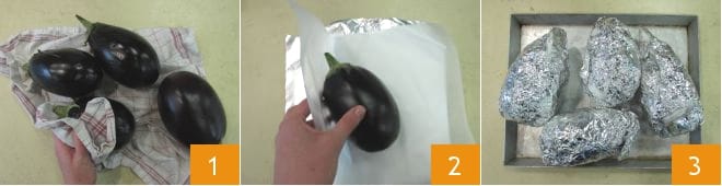 Um die Jacket Auberginen zuzubereiten, waschen und trocknen Sie zuerst die Auberginen gründlich 1. Legen Sie ein Blatt Backpapier auf ein Stück Alufolie und wickeln Sie jede Aubergine einzeln ein 2, um eine gut verschlossene Folie zu erhalten. Legen Sie die Päckchen auf ein Backblech 3 und backen Sie sie im vorgeheizten Umluftofen bei 220°C für etwa eine Stunde.