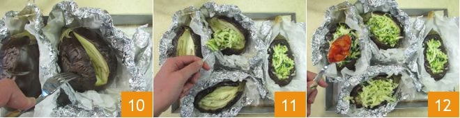 Holen Sie nun die Auberginen aus dem Ofen, öffnen Sie die Folie und schneiden Sie die Aubergine längs ein, dann entfernen Sie ein Stück Fruchtfleisch, um Platz für die Füllung zu schaffen 10. Füllen Sie die Auberginen mit der Zucchini-Caciocavallo-Mischung 11 und den abgetropften Tomaten 12.