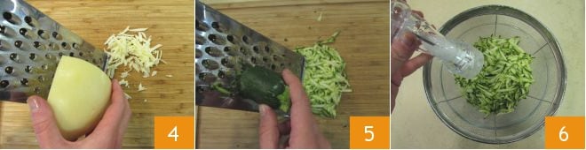 Bereiten Sie in der Zwischenzeit die Zutaten für die Füllung vor: Reiben Sie den Caciocavallo mit einer groben Reibe 4 und stellen Sie ihn beiseite. Waschen Sie die Zucchini und reiben Sie sie ebenfalls mit einer groben Reibe 5, dann geben Sie sie in ein Sieb, salzen Sie leicht 6 und lassen Sie sie abtropfen, damit sie Wasser verlieren.
