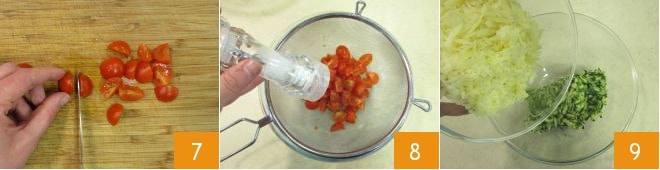 Machen Sie dasselbe mit den Kirschtomaten, die Sie gewaschen und in kleine Würfel geschnitten haben 7: Geben Sie sie in ein Sieb, salzen Sie leicht 8 und lassen Sie sie abtropfen. Gegen Ende der Garzeit der Auberginen geben Sie die abgetropften Zucchini in eine Schüssel, fügen etwa zwei Drittel des geriebenen Caciocavallo hinzu 9 und mischen Sie.