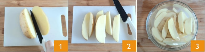 Um die Ofenkartoffeln mit Schale zuzubereiten, wascht die Kartoffeln zuerst gründlich unter fließendem Wasser. Schneidet die Kartoffeln zuerst in der Hälfte 1 und dann in Spalten mit einer Dicke von maximal einem halben Zentimeter 2. Legt die Spalten in eine große Schüssel, bedeckt sie mit kaltem Wasser und lasst sie 20 Minuten einweichen, damit sie einen Teil der Stärke verlieren 3.