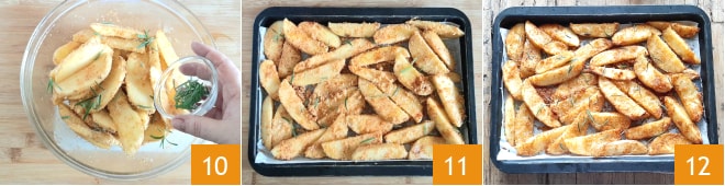Auch den Rosmarin 10 hinzufügen und erneut mischen. Verteilt die gewürzten Kartoffeln auf einem mit Backpapier ausgelegten Backblech, ohne sie zu überlappen 11. Im vorgeheizten statischen Backofen bei 200° etwa 40-45 Minuten backen. Wenn sie schön goldbraun und knusprig werden, aus dem Ofen nehmen und sofort servieren 12!