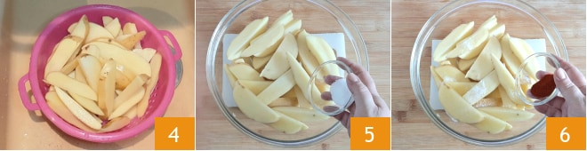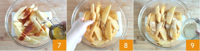 Nach der Einweichzeit die Kartoffeln abgießen 4 und mit einem Tuch oder Küchenpapier trocknen, dann in eine Schüssel geben und mit Salz 5 und Paprika 6 würzen.